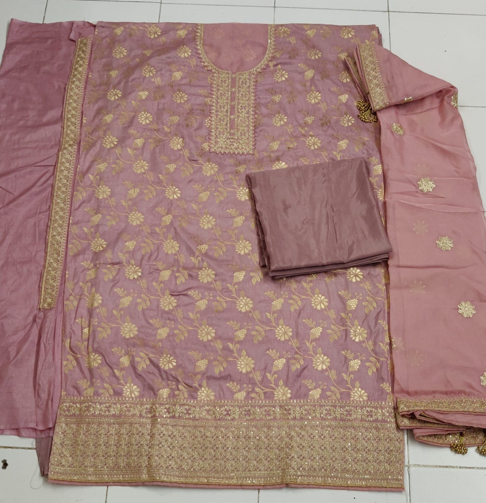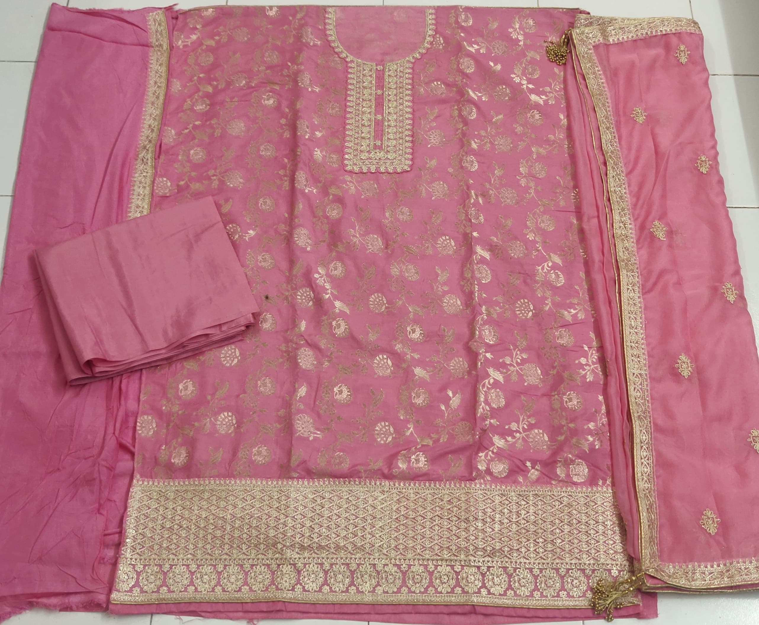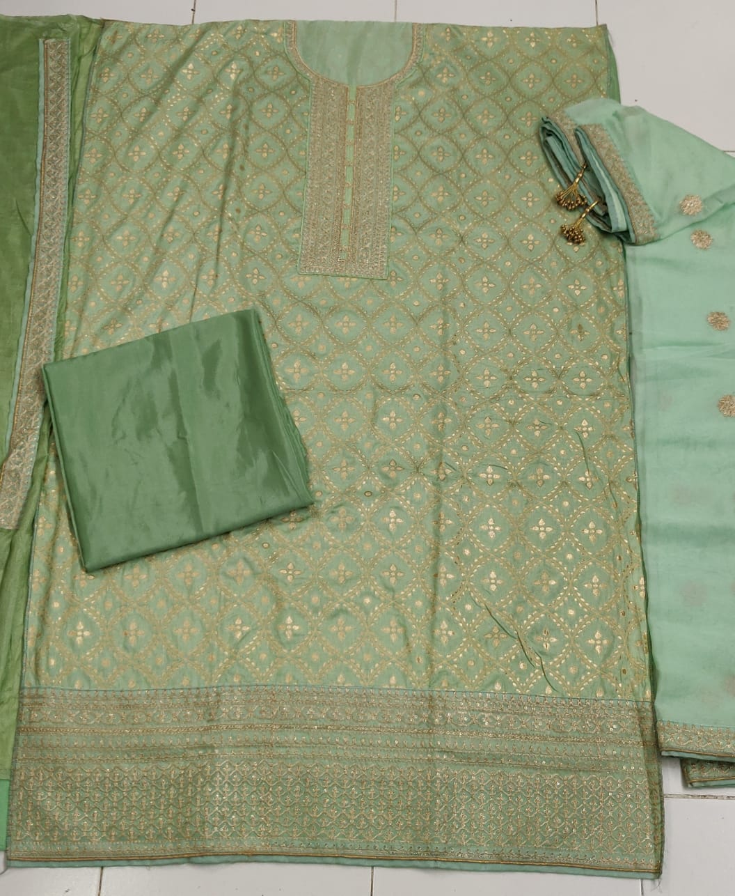 | Fabric Details: | TOP Dola Jecard Silk With Embrodery Work Sleeves :- Dola silk INNER Dual Santoon attech BOTTOM Heavy Dual Santoon DUPATTA Heavy Silk With Embro Work With Latkan |