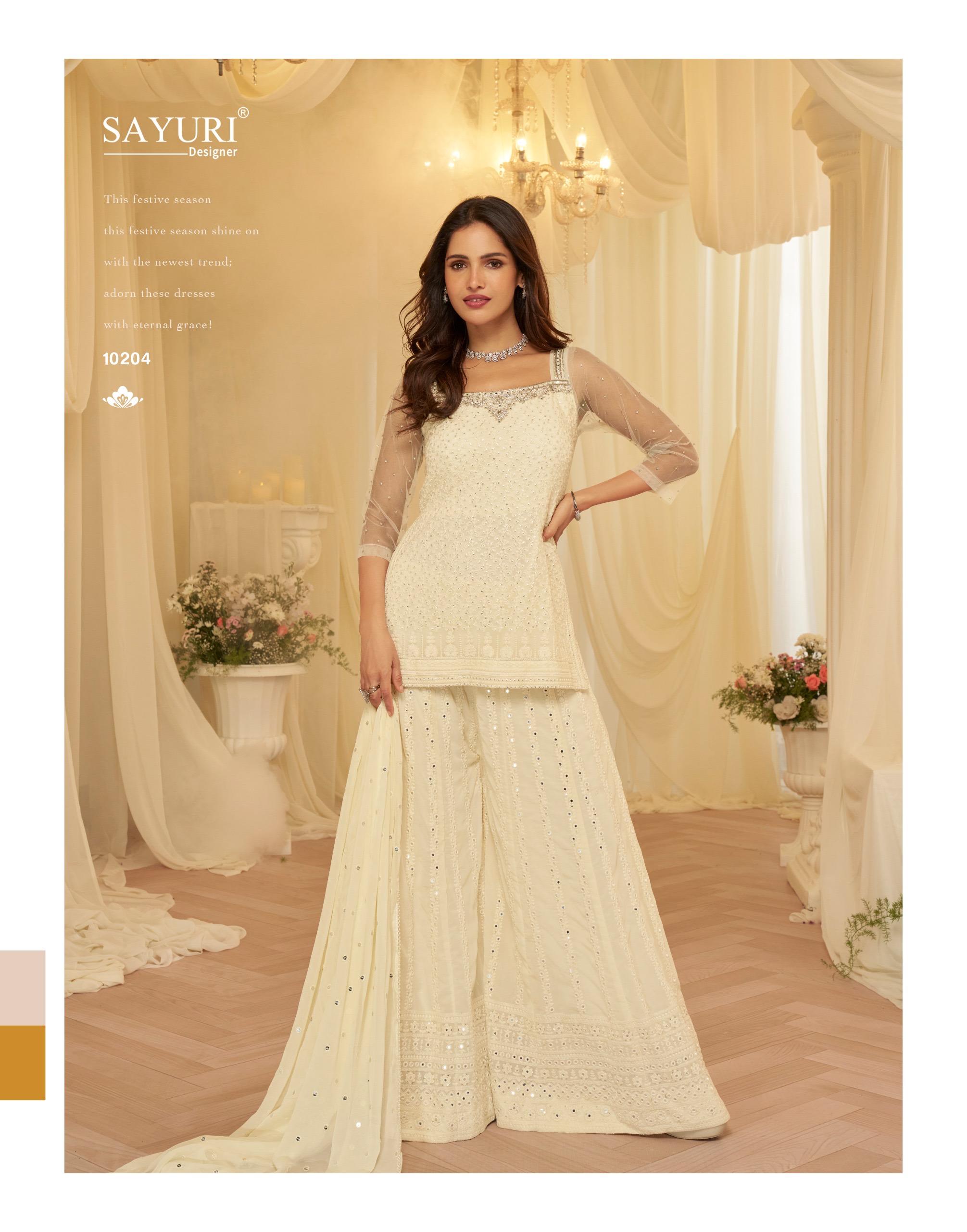 | Fabric Details: | PREMIUM REAL GEROGETTE ( LATEST TRENDY CHIKANKARI EMBROIDERED TOP WITH EMBROIDERED SHARARA AND DUPATTA ) |