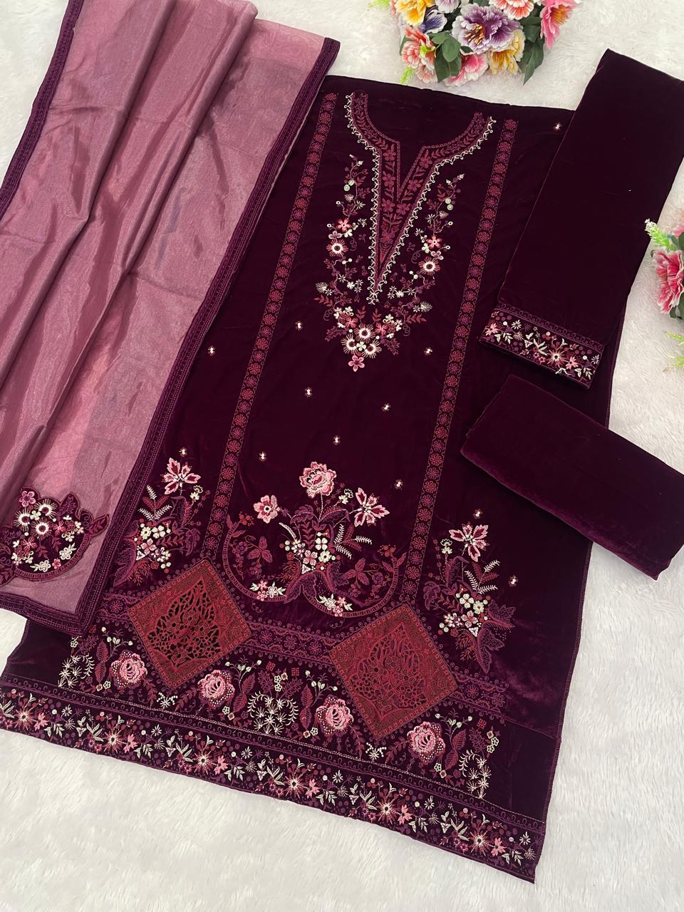 | Fabric Details: | TOP & SLEEVES : Velvet with Heavy Embroidered 3mm Sequence Work & Cut Work DUPATTA : Twirl Net with Heavy Embroidered Velvet Patch & 4 Sided Lace BOTTOM : 9000 Velvet (2 mtr Unstitched) TOP LENGTH : Max upto 43” or 110 Points TOP WIDTH : Max upto 29” or 0.74 cm |