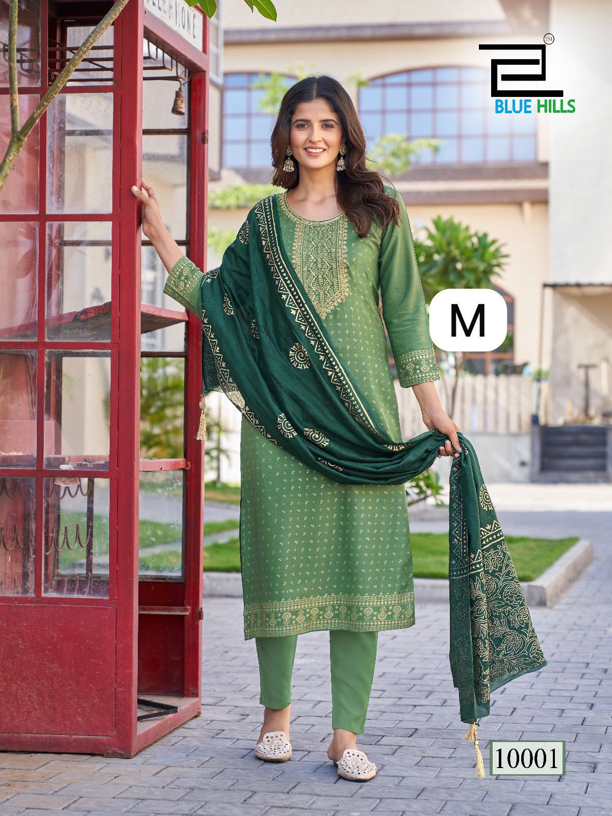 | Fabric Details: | Top-: Rayon Foil Print + Embroidery Work Bottom-: Rayon 14kg Dupatta-: Chanderi print with Latkan |
