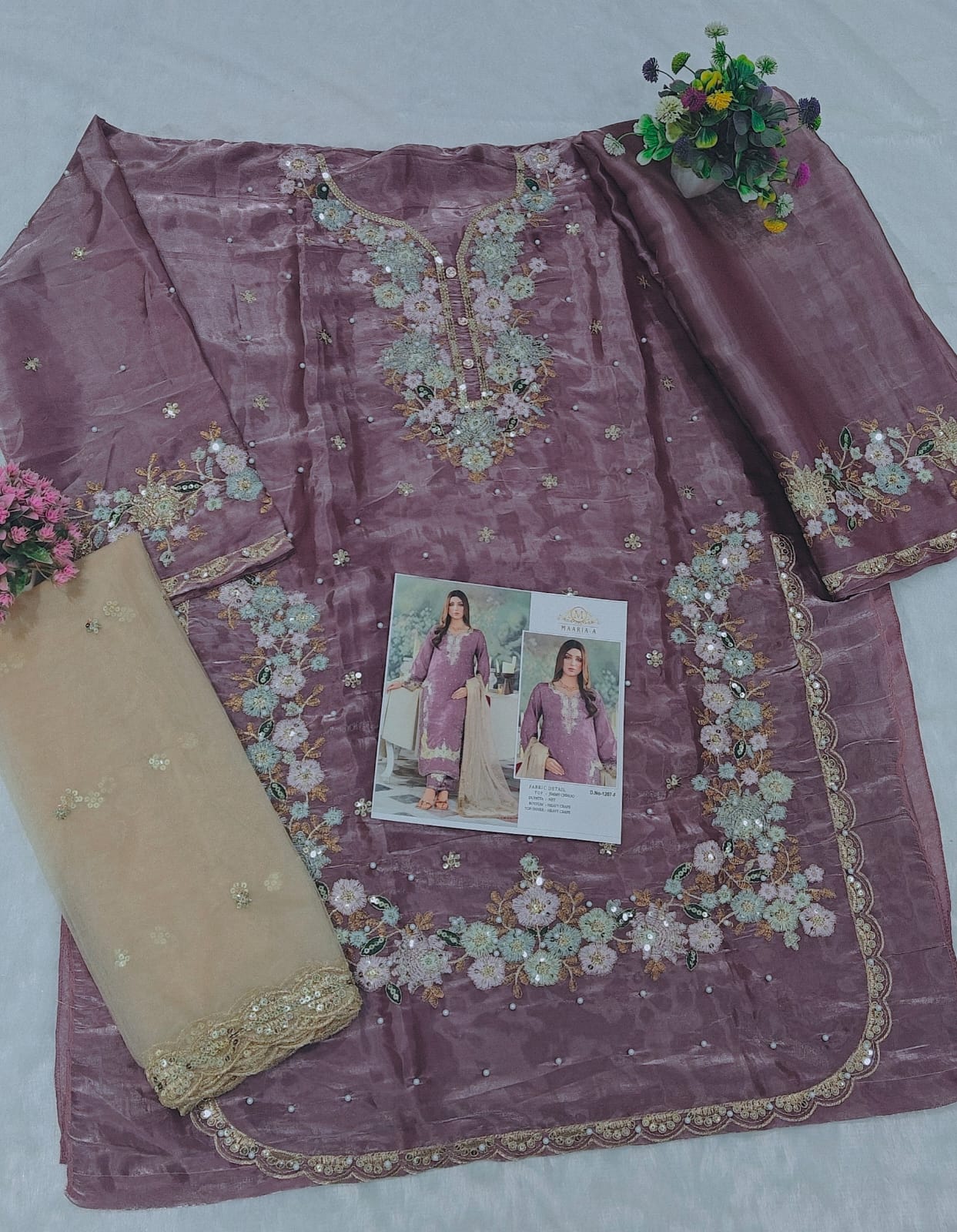 | Fabric Details: | TOP :- Jimmy Choo with embrodery Work With Moti Inner :- Crep Silk Length :- Max up to 42” Size :- Max up to 44" BOTTOM :- Jimmy Choo With Inner Crep Silk (1.60 mtr) Dupatta :- Net With Havy Work |