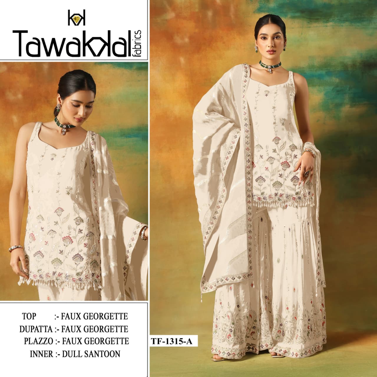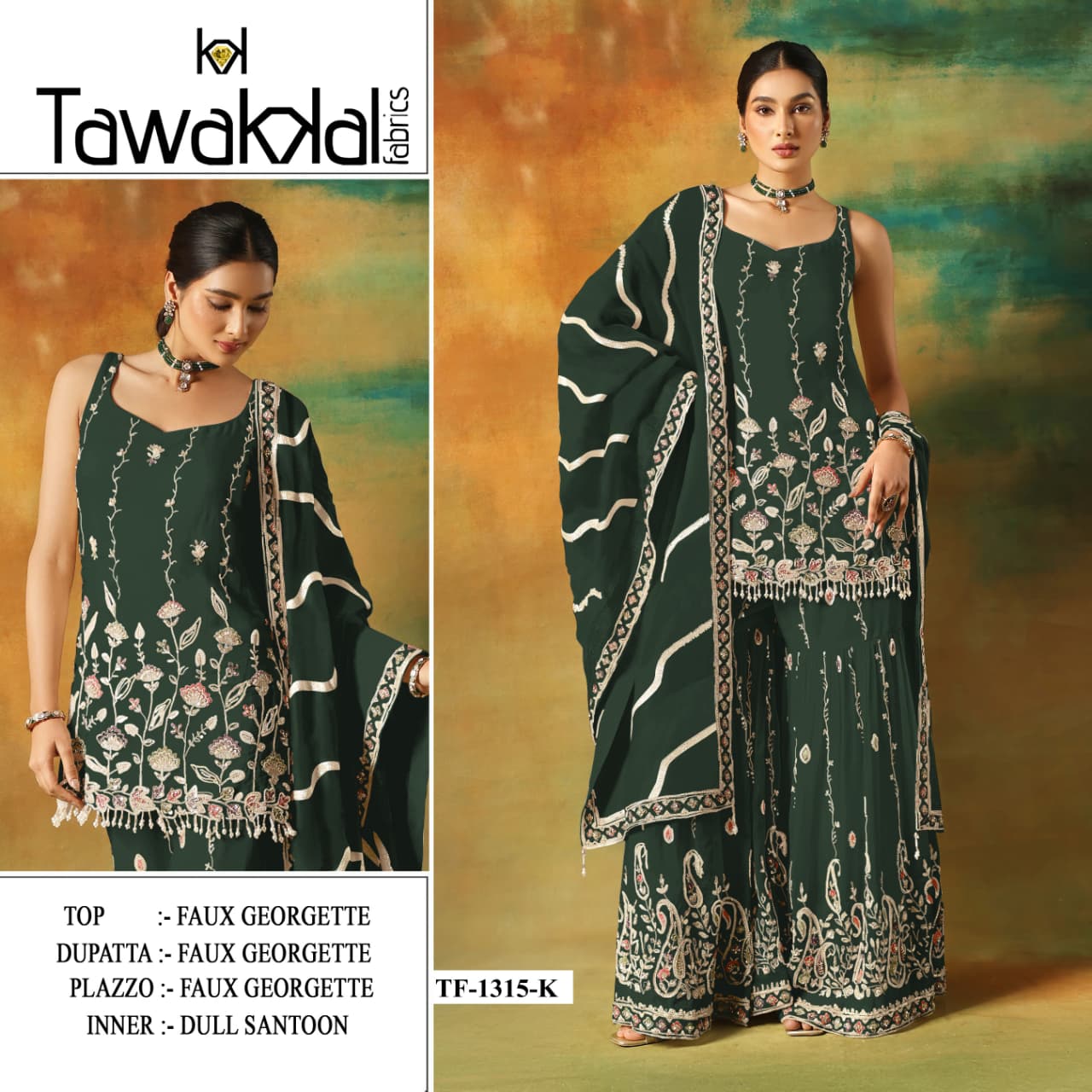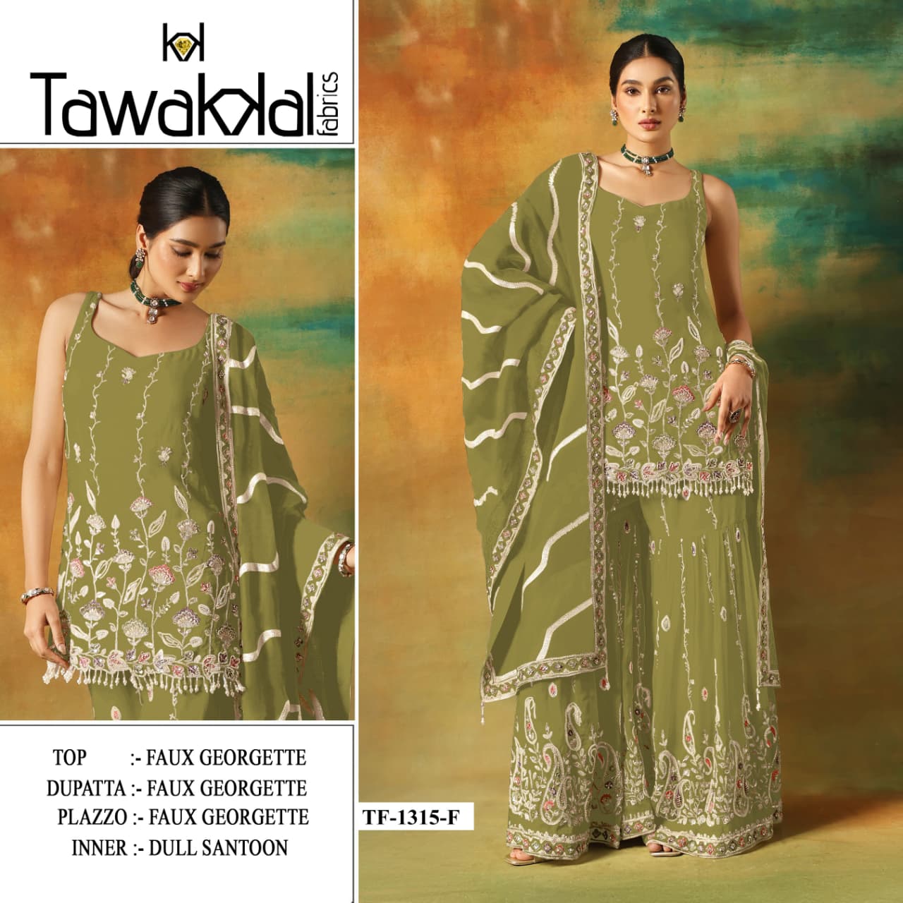 | Fabric Details: | TOP Heavy Foux Georgette With Embroidery Work With Zarkhan Sleeves Foux Georgette With Work Inner Attached Santoon Silk BOTTOM Heavy Foux Georgette With Embroidery Work (2.5 MTR) Inner Santoon Silk DUPATTA Heavy Foux Georgette With Work |