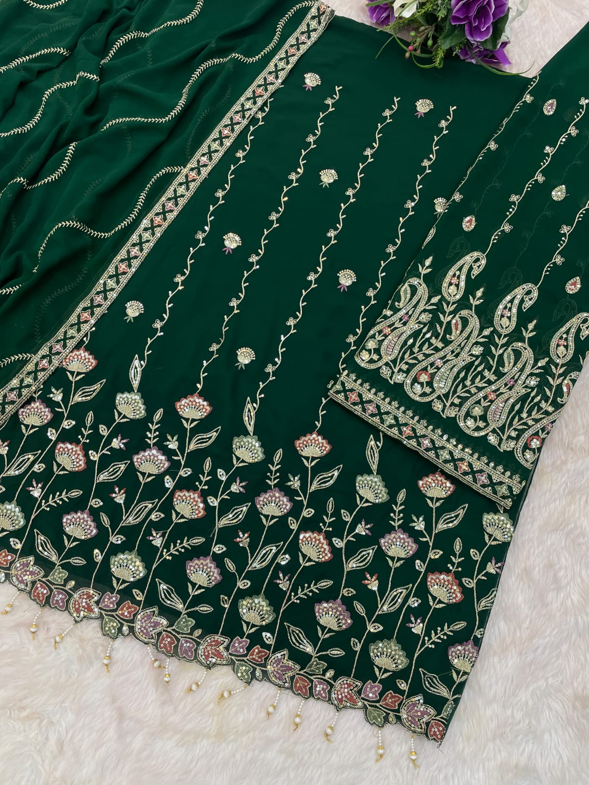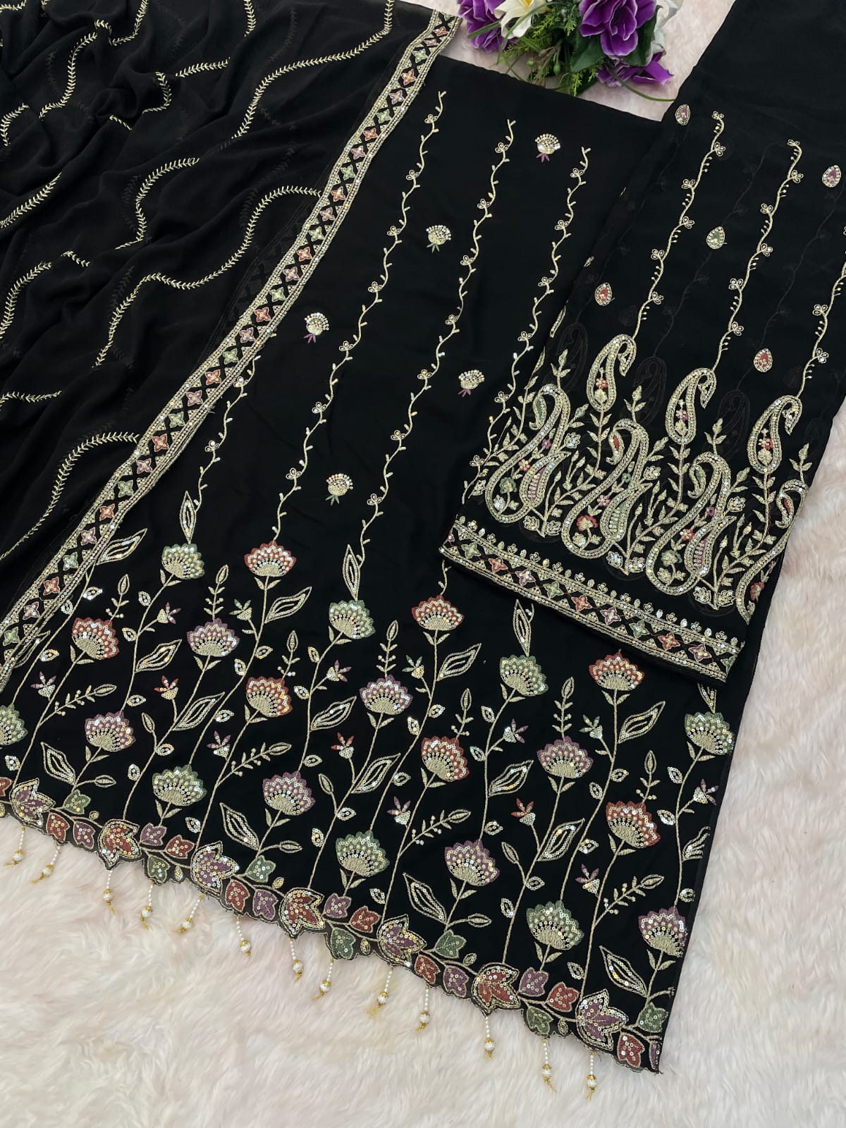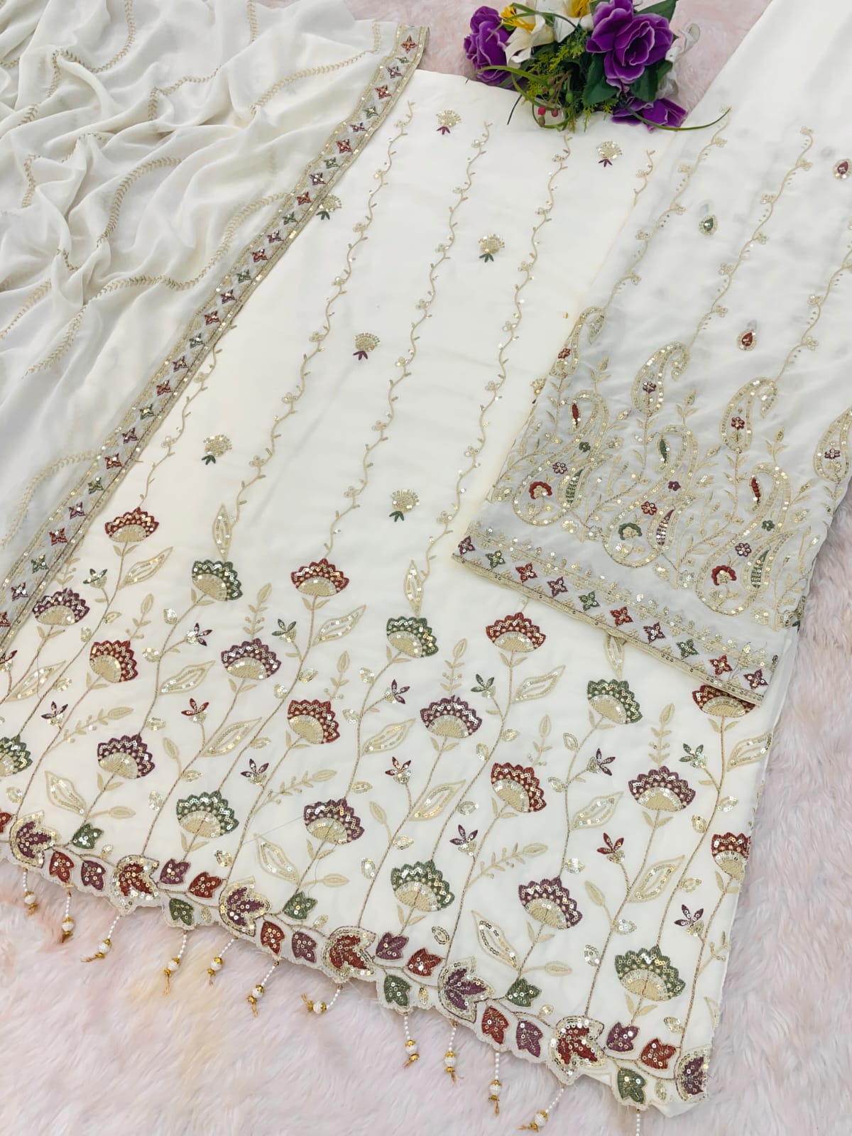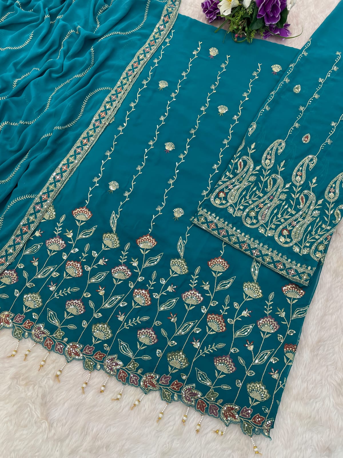 | Fabric Details: | TOP Heavy Foux Georgette With Embroidery Work With Zarkhan Sleeves Foux Georgette With Work Inner Attached Santoon Silk BOTTOM Heavy Foux Georgette With Embroidery Work (2.5 MTR) Inner Santoon Silk DUPATTA Heavy Foux Georgette With Work |